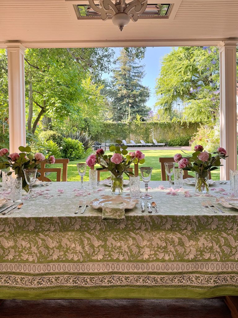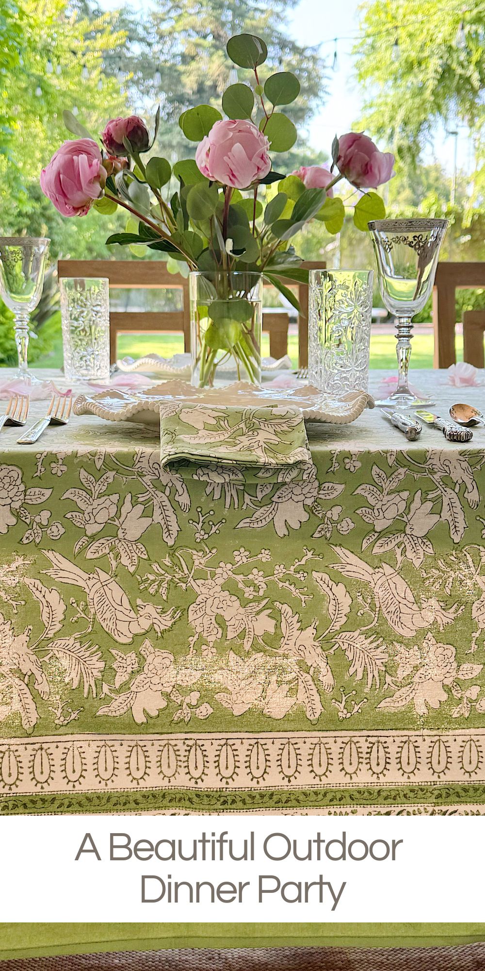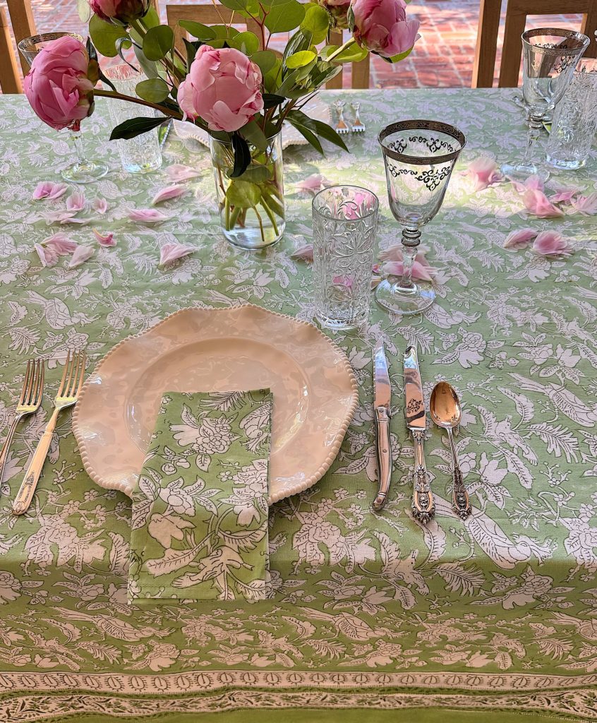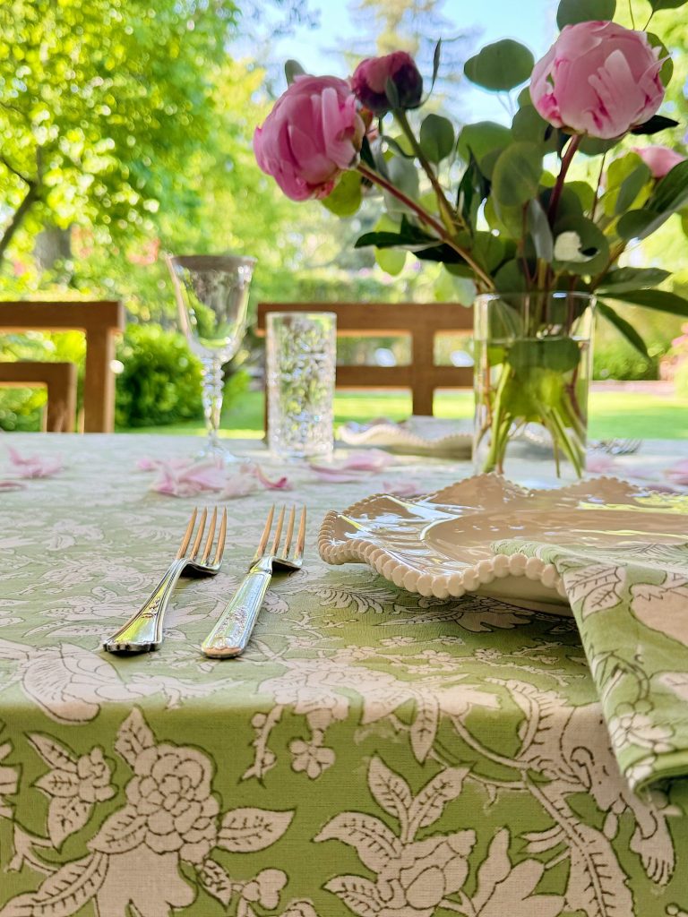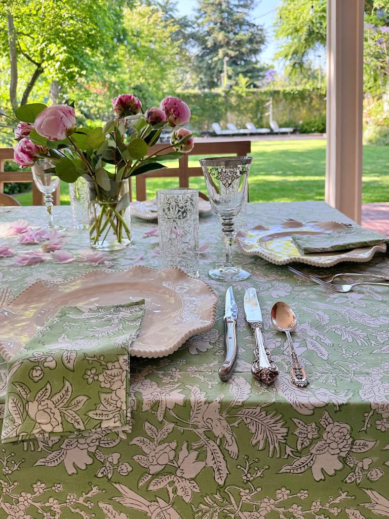 The star of the table was my gorgeous olive green tablecloth and matching napkins from CPC Cotton Print Club. If you haven’t discovered them yet, CPC makes the most beautiful 100% cotton tablecloths and napkins in all kinds of patterns and colors.