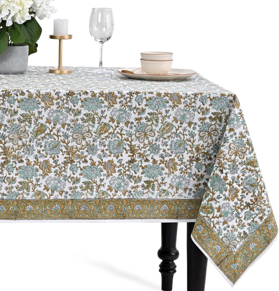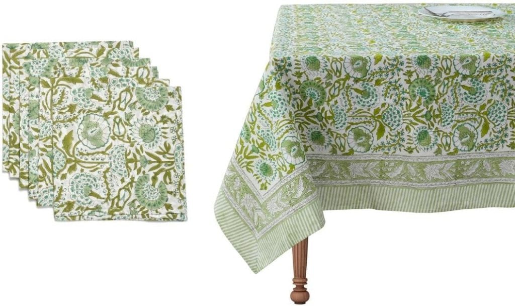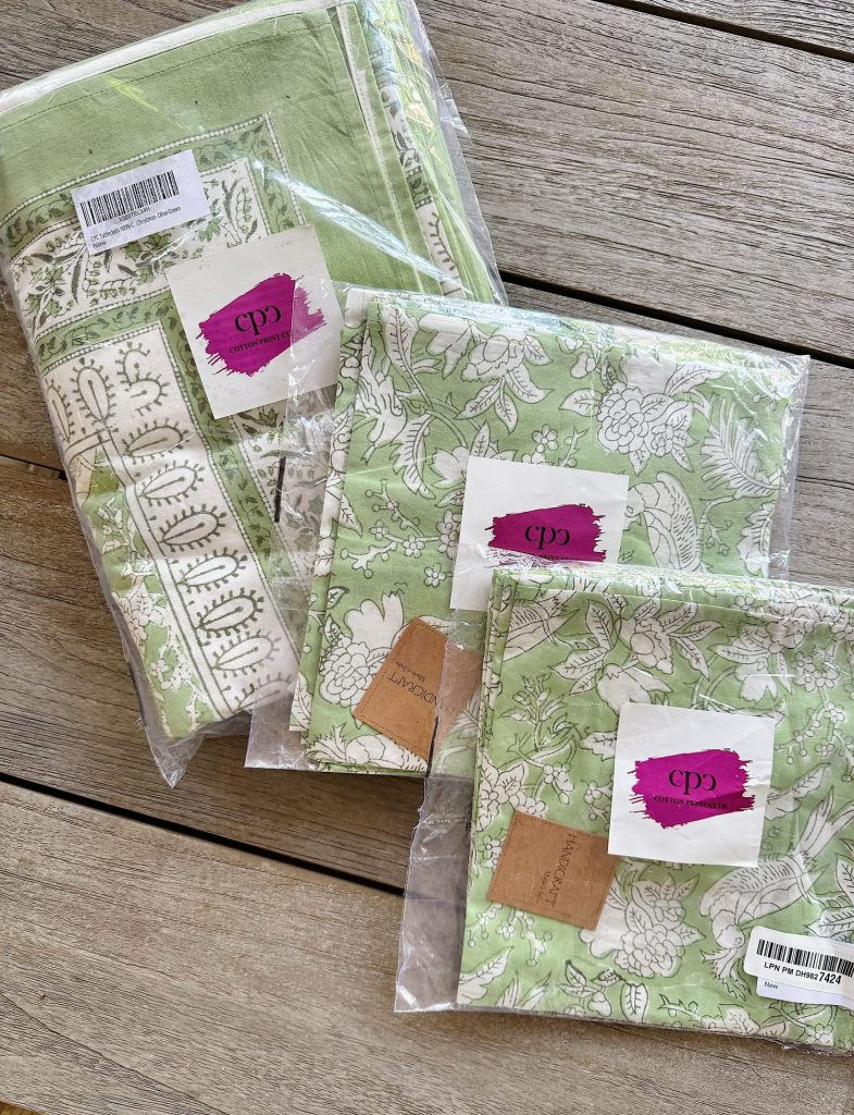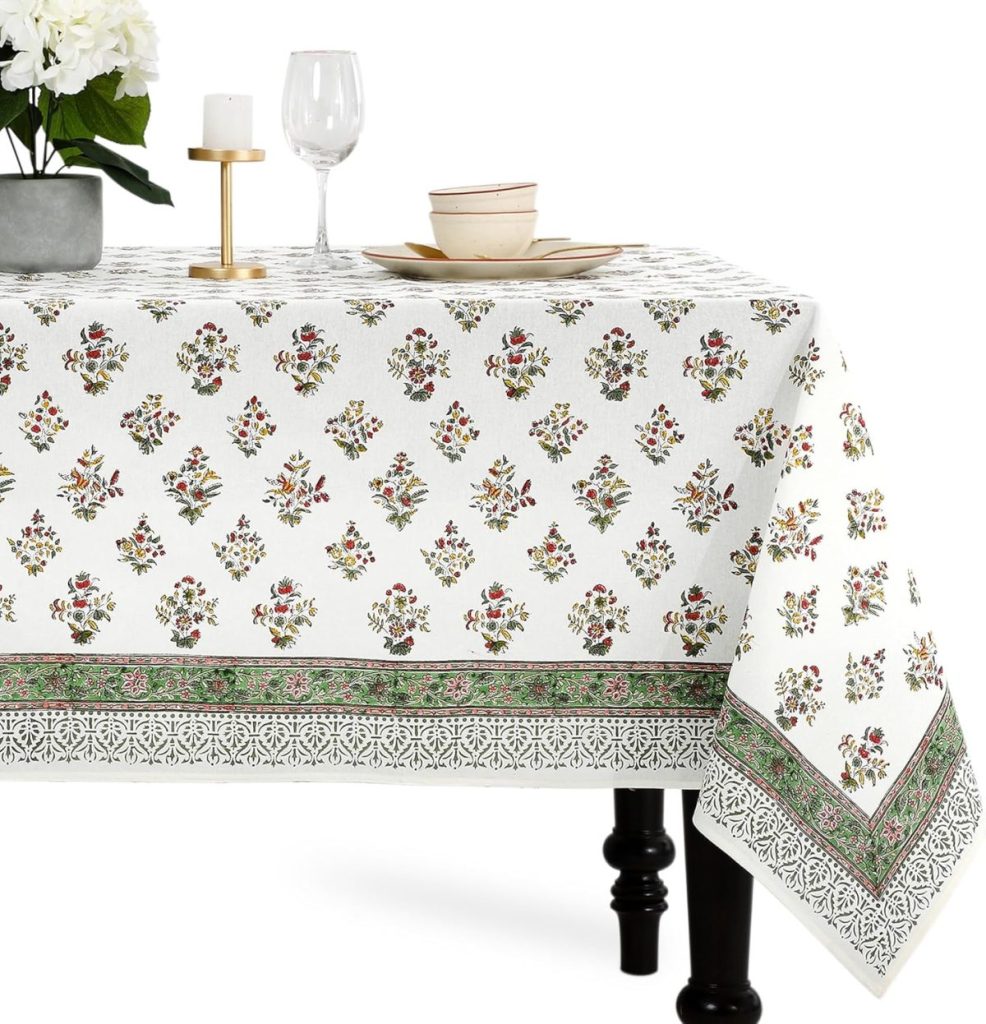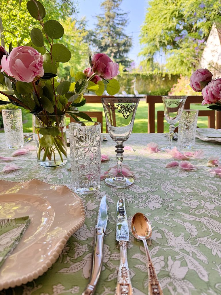 The star of the table was my gorgeous olive green tablecloth and matching napkins from CPC Cotton Print Club. If you haven’t discovered them yet, CPC makes the most beautiful 100% cotton tablecloths and napkins in all kinds of patterns and colors.