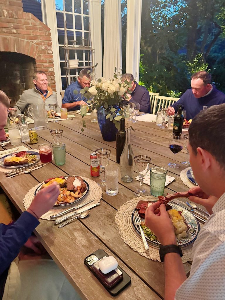 The week kicked off on Wednesday night with a dinner party for 13 guests. Eight of Andrew’s longtime friends from Marin Country Club joined us, and I served a full spread: grilled tri-tip, shrimp, pork ribs, twice-baked potatoes, cashew salad, and for dessert, not one, but two types of mud pie—one with coffee chip ice cream and the other with a peanut butter chocolate twist. It was a casual evening full of great food and even better company, and it set the tone perfectly for the tournament days ahead.