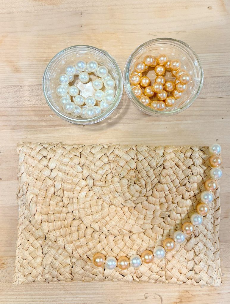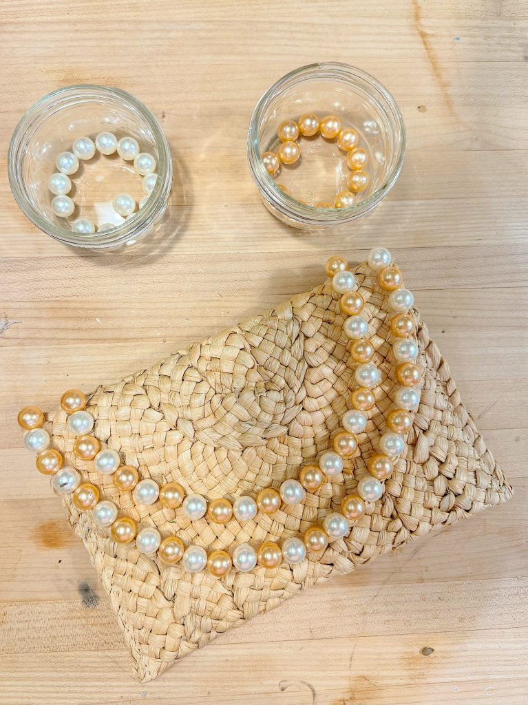 Once the tote bags were complete, I turned my attention to the straw clutch. This clutch purse was already charming, but I wanted it to glam it up. I kept it simple and elegant, adding a cluster of large white and gold pearl beads to the clutch’s front flap.