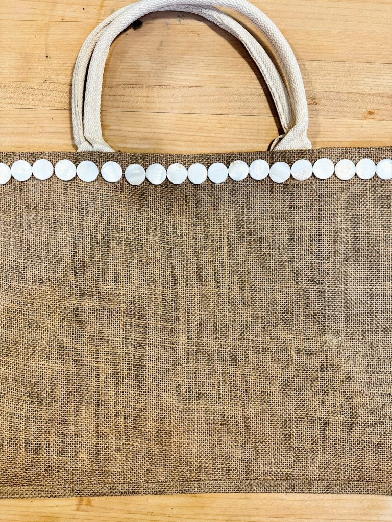 First, I arranged the embellishments on the bags before attaching them permanently. I took my time experimenting with different layouts, eventually settling on a pattern that placed the burlap flowers at the top corners of the tote, accented by groups of mother-of-pearl beads and pearls.