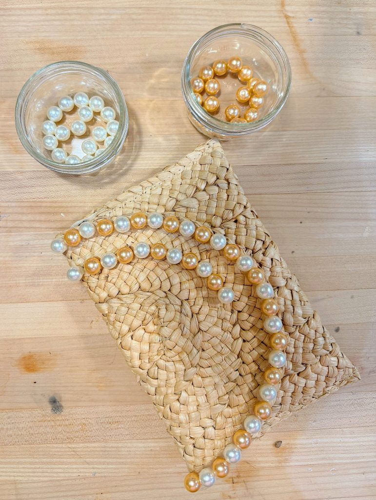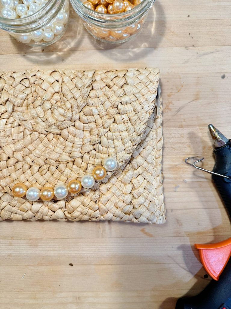 Using hot glue again, I arranged two rows of white and gold pearls along the flap’s seams. This simple addition transformed a lovely straw purse into a stylish accessory perfect for summer gatherings or a casual night out.