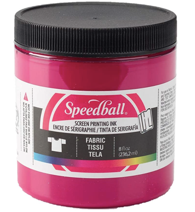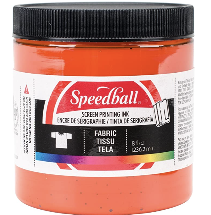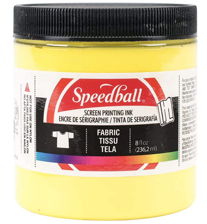 I used Speedball Fabric Screen Printing Ink. It sets with heat, so all you must do is iron it. But it goes on so quickly and lasts for a long time!