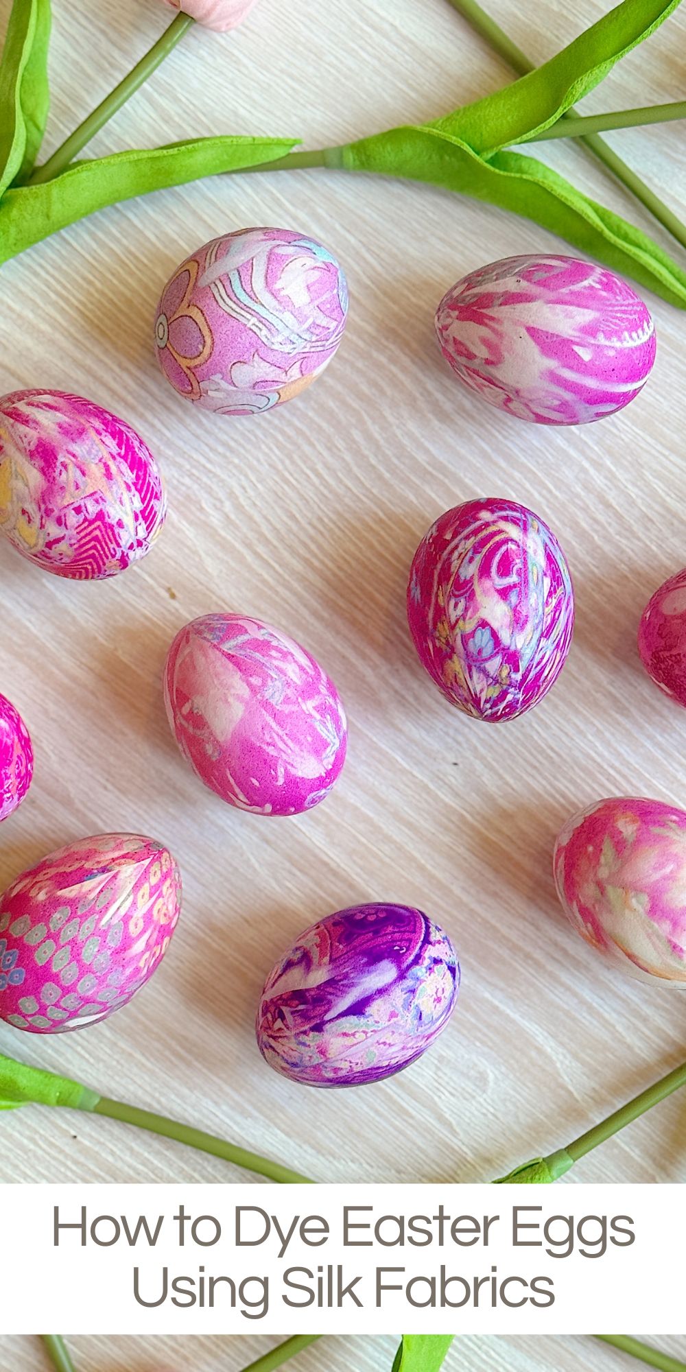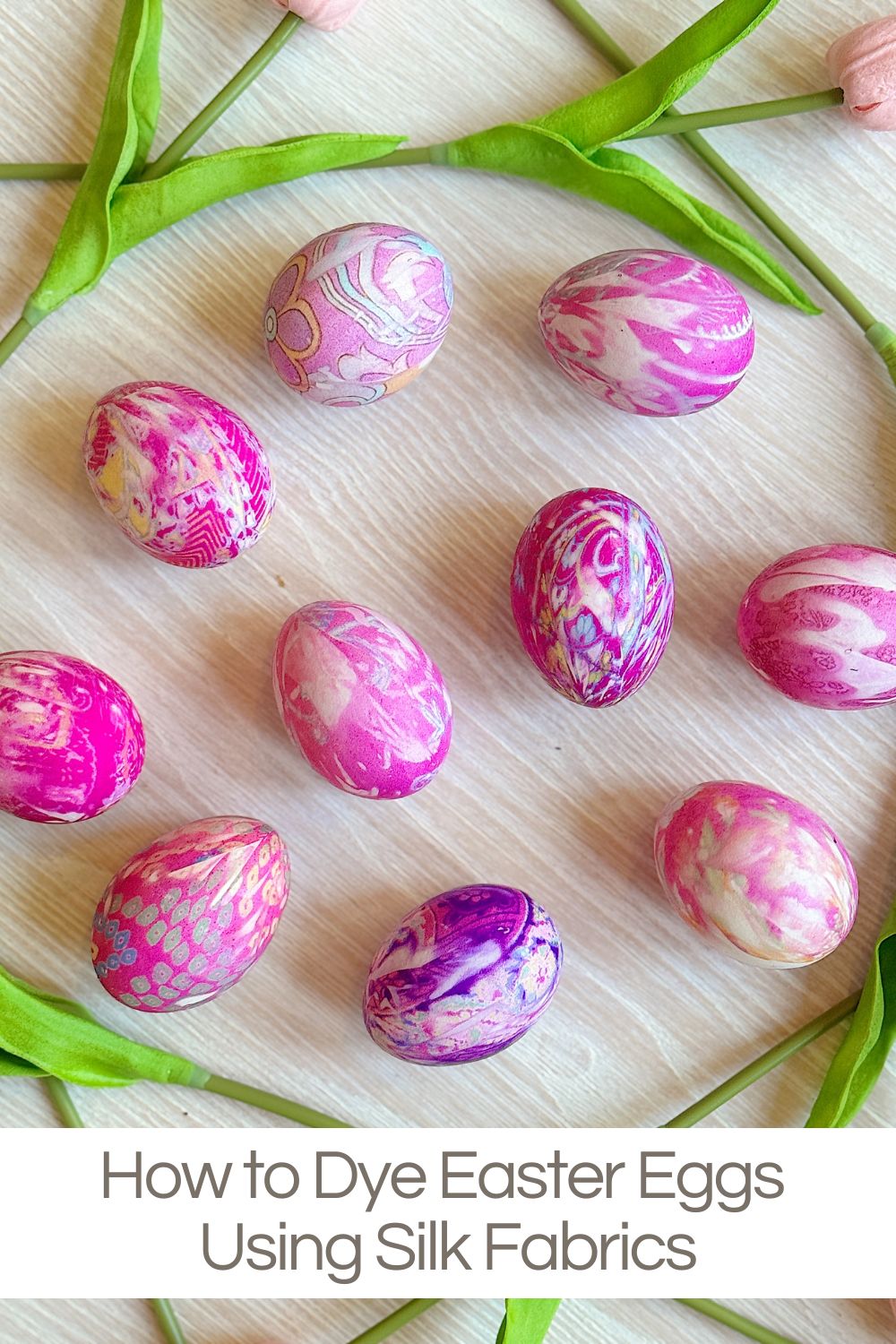 Ten pink and purple patterned Easter eggs arranged on a light wooden surface, surrounded by green stems with leaves. Text at the bottom reads, "How to Dye Easter Eggs Using Silk Fabrics.