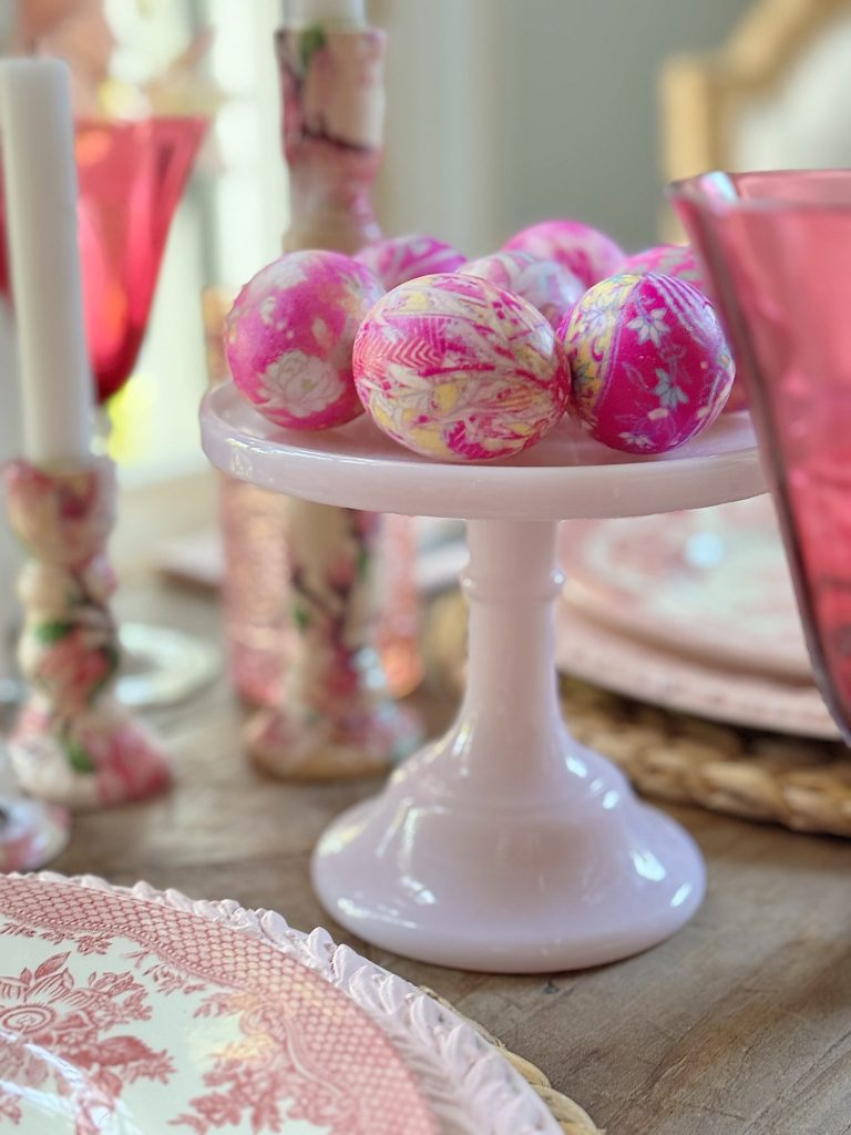 A white cake stand holds decorative pink and floral-patterned eggs. Nearby, pink patterned glassware and plates are arranged on a wooden table.