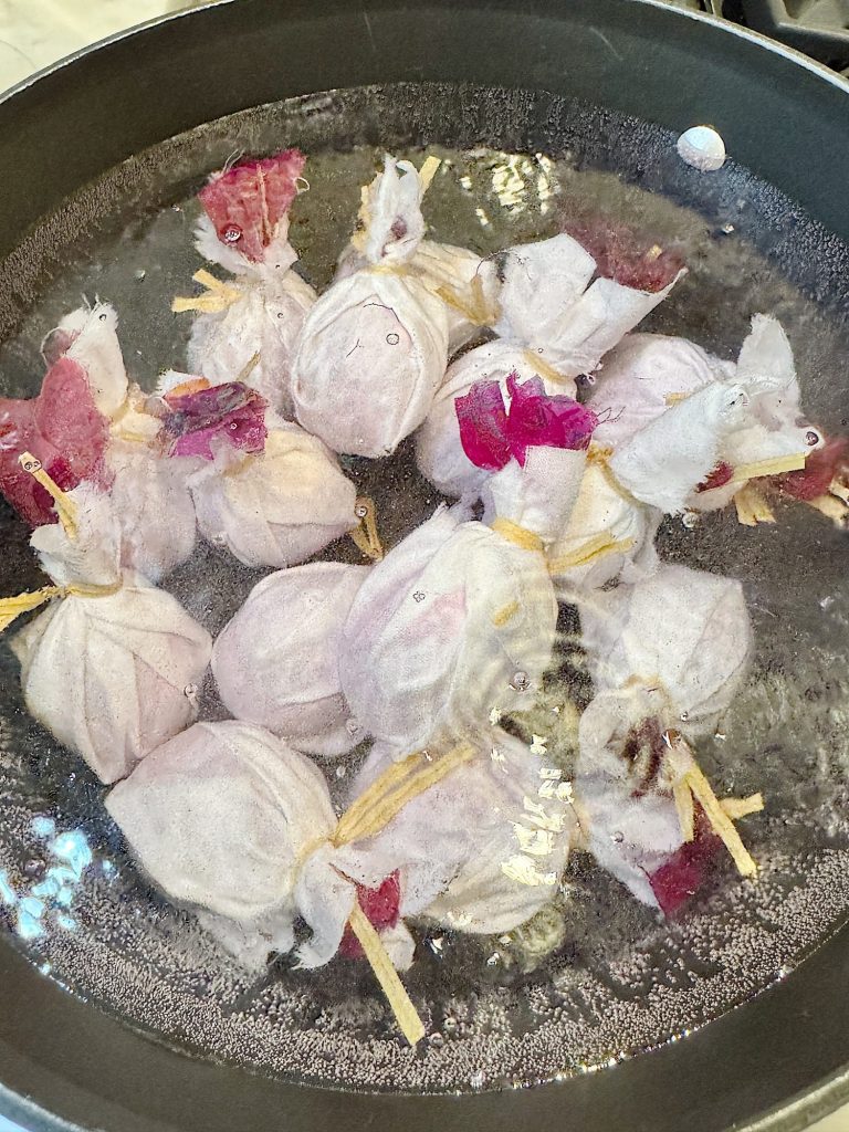 Four fabric bundles tied with rubber bands are simmering in a pot of water on a stove.