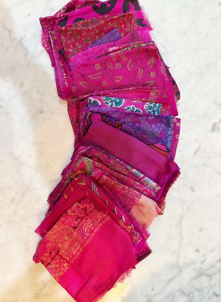 A stack of neatly folded, vibrant pink fabric squares with various patterns and textures on a marble surface.