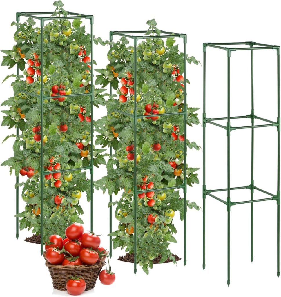 When planting a tomato plant,, you need to ensure you have tomato supports. These supports are called tomato cages, and they come in plastic, metal, and wood. I recently made my own wood tomato cages, and you can find the complete DIY here. Recently I acquired some square wire tomato cages, which are pictured here.