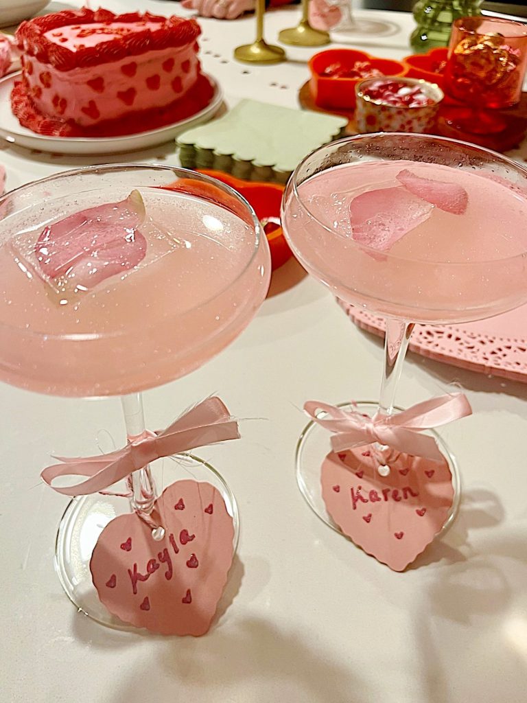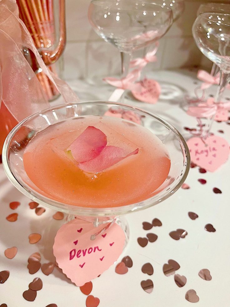 💖 Start with a signature cocktail – A Pink French 75 with glitter and rose ice cubes is a showstopper!