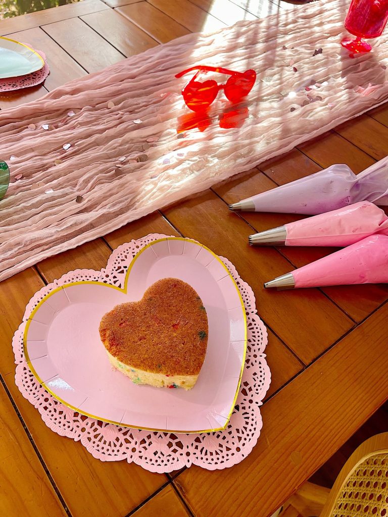 Devon had prepared the cakes in advance using Funfetti cake mix (because, let’s be honest, it’s a classic). The silicone heart molds she used came in three different sizes: 4-inch, 6-inch, and 8-inch. For this party, she focused on decorating the mini 4-inch cakes, which were the perfect individual size.