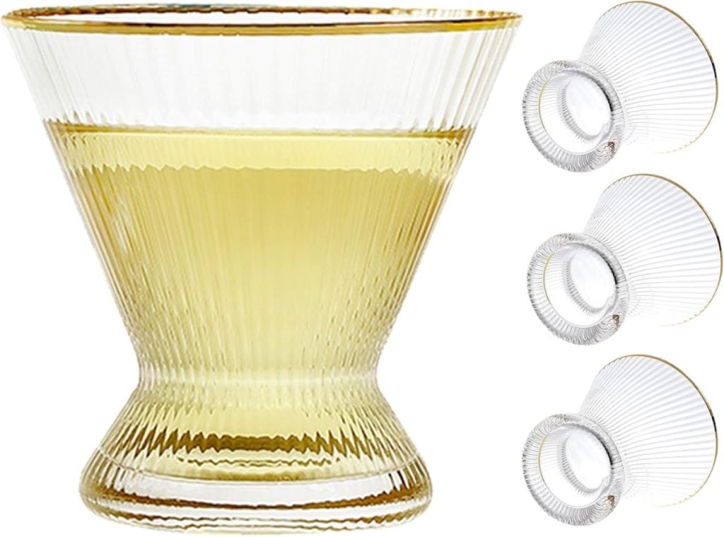 Four ornate golden glass tumblers on a metal tray, with a decanter in the background on a wooden table.
