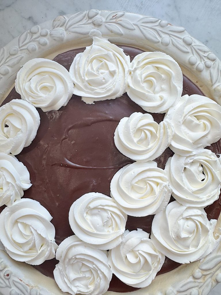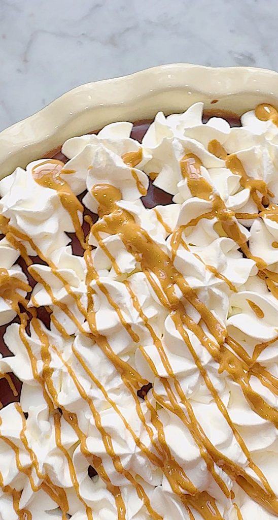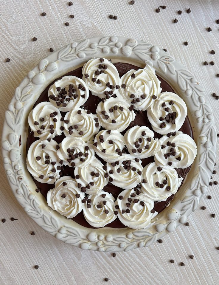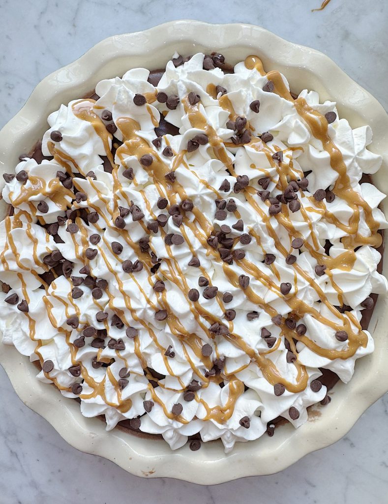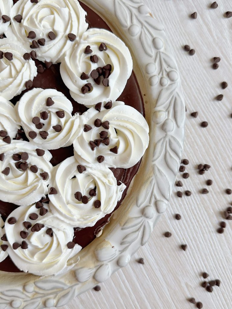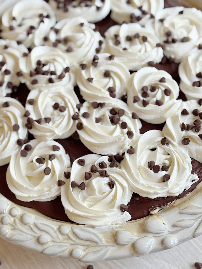 - Fill a pastry bag with the whipped cream and decorate the top of the mud pie.