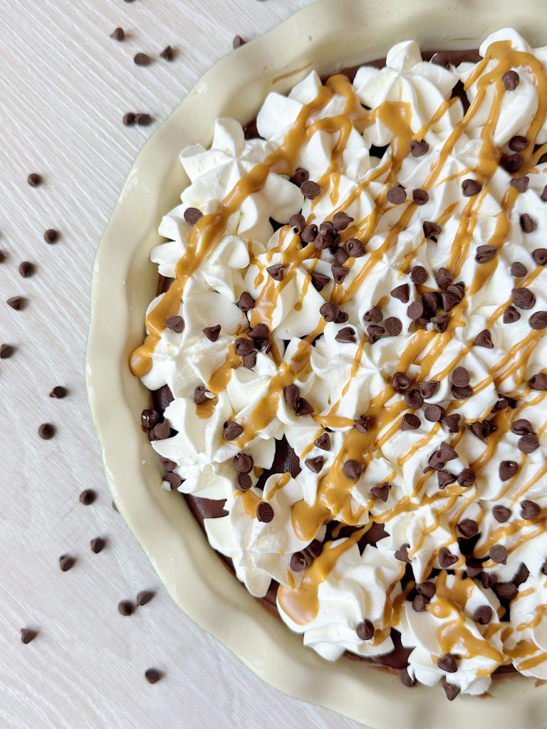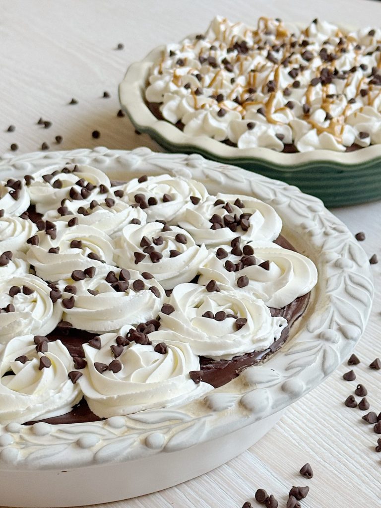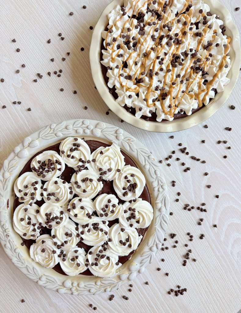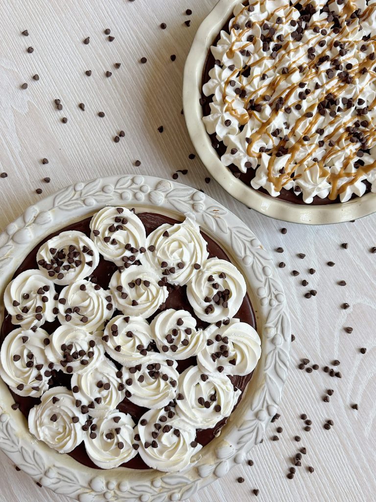Decorate pies with generous swirls of whipped cream and sprinkle extra chocolate chips. Slice and serve straight from the freezer.