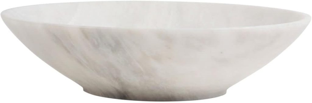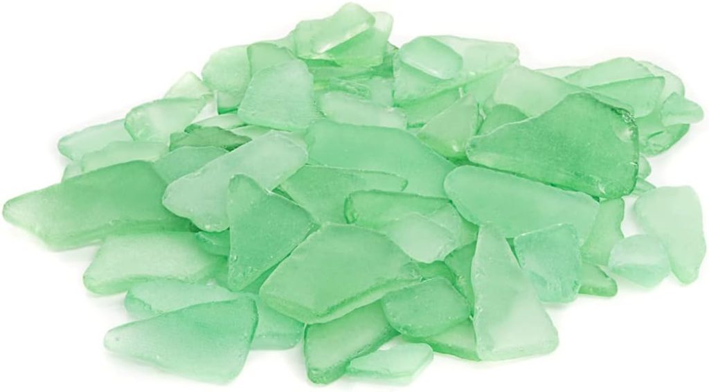 The marble platters with old glass stoppers and recycled glass pieces from a windshield factory add a touch of elegance and interest to the space. The glass pieces have a natural and organic texture that complements the smooth texture of the marble.