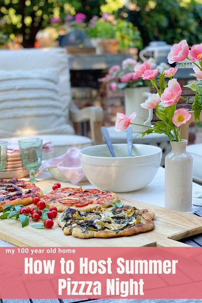 I have wanted to have a fun pizza night at our home to celebrate spring. I thought I would host it on the table in our family room. But then I got thinking … and I walked around the backyard looking for an unexpected spot to host this fun evening. I finally decided on the porch and patio at the back of our home. It is just perfect.