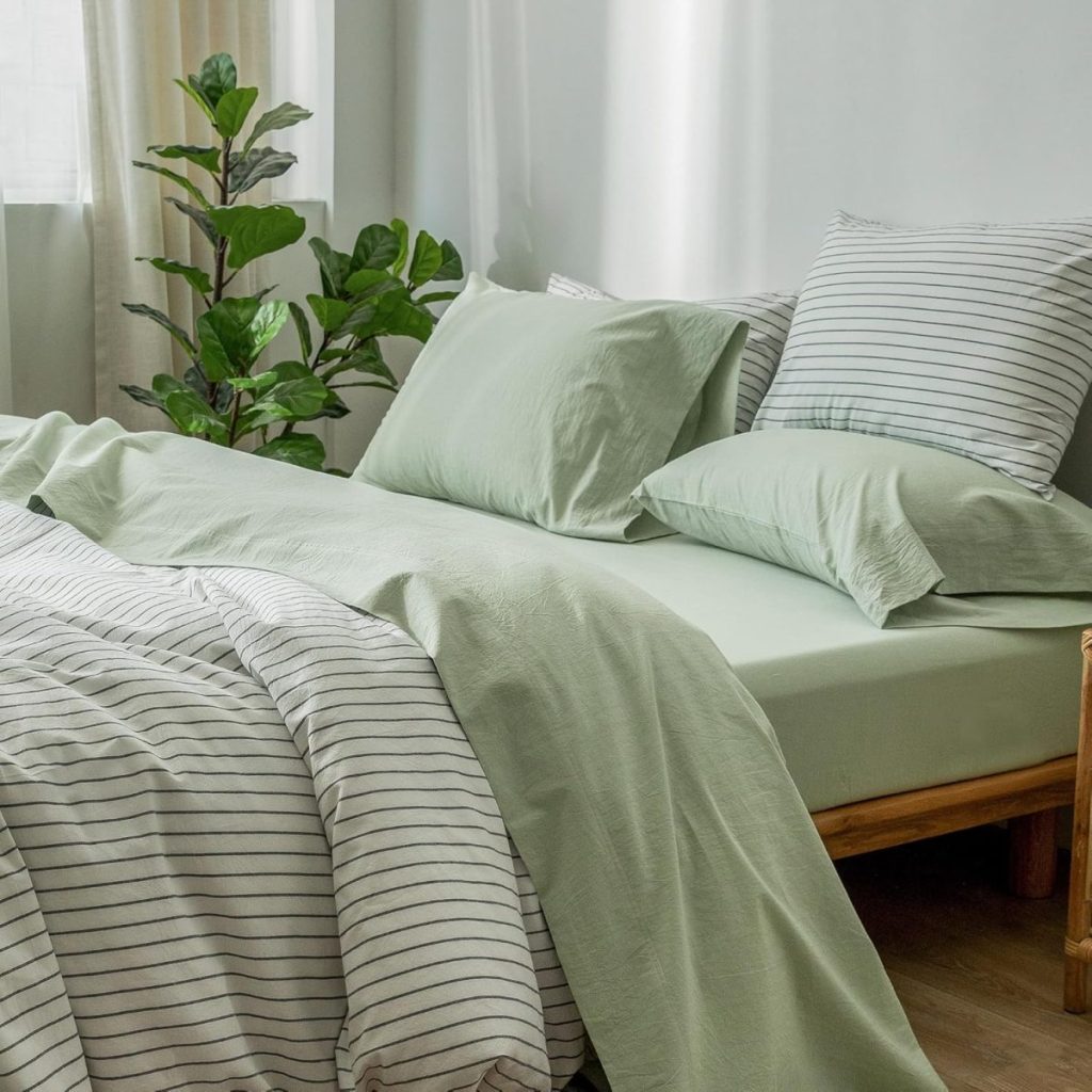 Start with your bedding, and it makes a massive difference in how cool you feel at night. Ditch the heavy comforters and flannel sheets, and instead opt for: