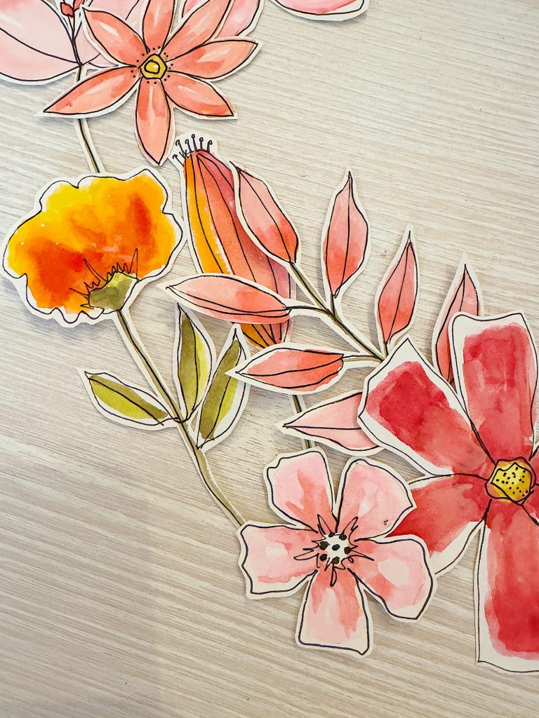 Watercolor illustrations of various pink, orange, and yellow flowers with leaves are cut out and arranged on a light wooden surface.