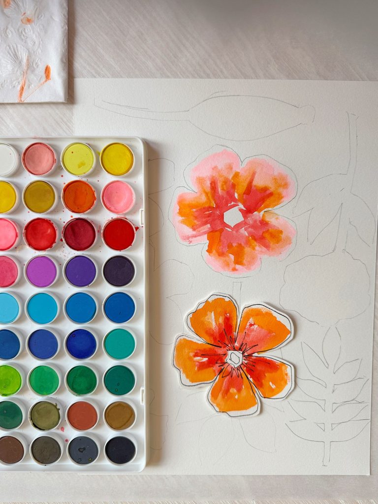 Once you’ve sketched all your flowers, it’s time to paint! I chose a soft, spring-inspired palette of pinks and oranges, with touches of yellow and coral. Watercolor is very forgiving; part of the beauty is how the colors bleed and blend.