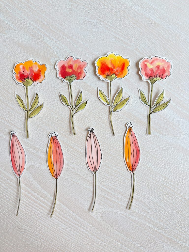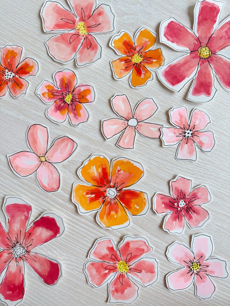Now it’s time to cut them out! I left a slight white border around each flower to mimic the look of a sticker or die-cut. This gives them a clean, finished appearance and helps them pop when layered against other materials.