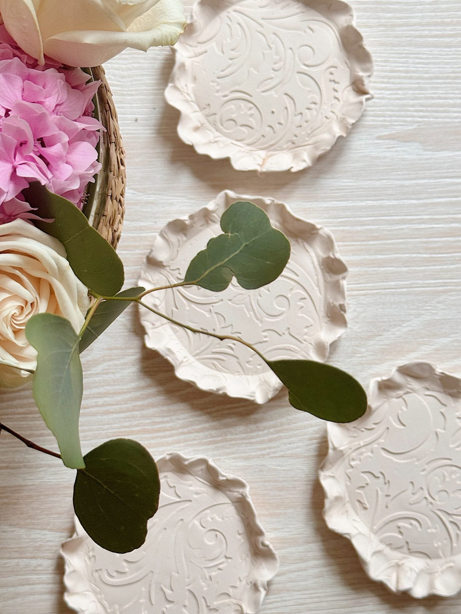 Four decorative, round ceramic coasters with embossed patterns and ruffled edges arranged on a light wooden surface next to a bouquet of flowers.