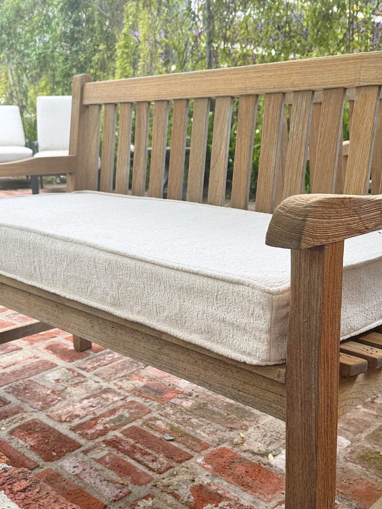Then I discovered it worked on our twenty-year-old teak furniture. Of course, the benches looked so great that I decided I needed new cushions, so I bought six new custom cushions.