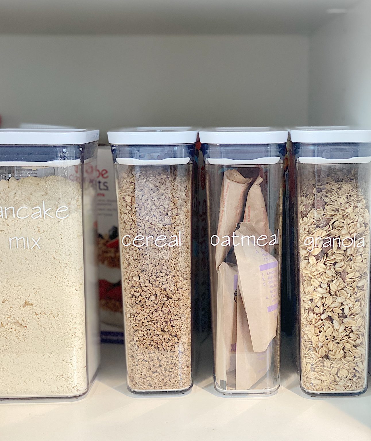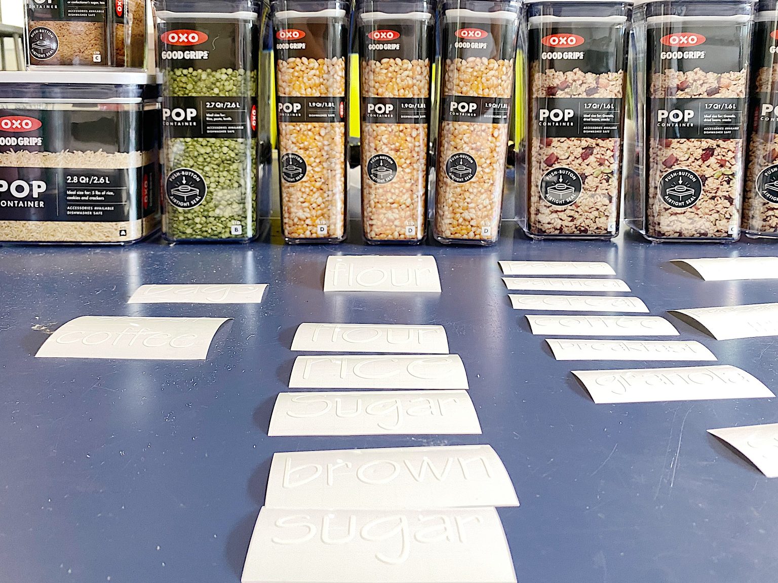 One of my favorite things about these OXO Good Grips containers is that they have a stripe on the temporary label (which is actually on the inside) that you can use as a guide to attach the pantry labels. It was the best system ever and went so fast.